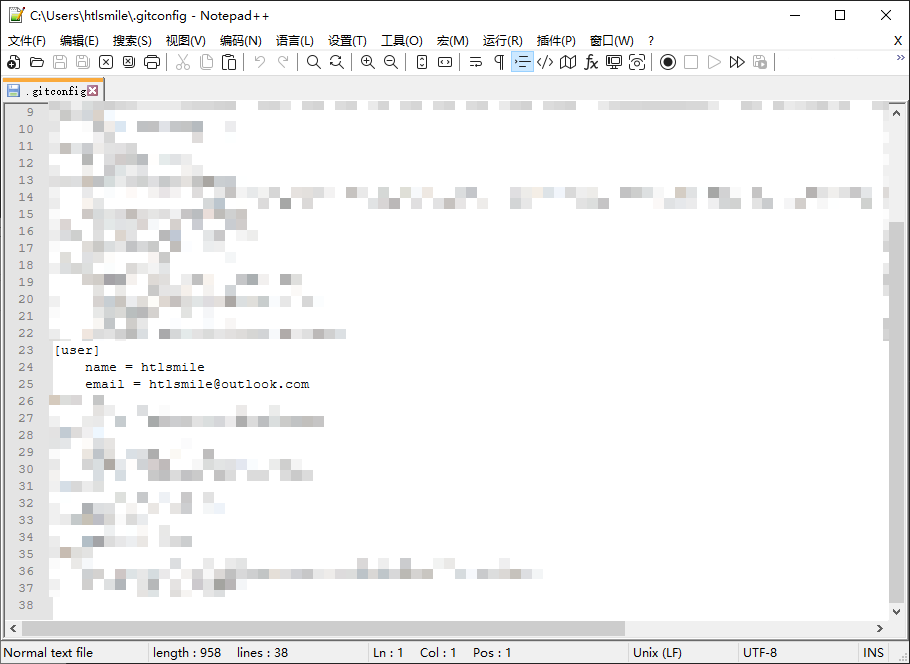 可以直接打开 C:\Users\htlsmile\.gitconfig 文件手动配置。