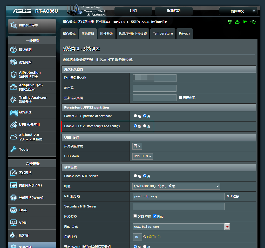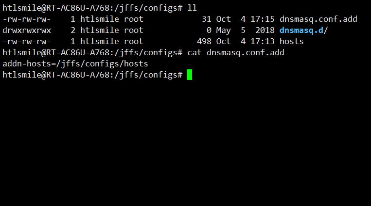 /jffs/configs目录下创建dnsmasq.conf.add文件,内容为addn-hosts=/jffs/configs/hosts - 在