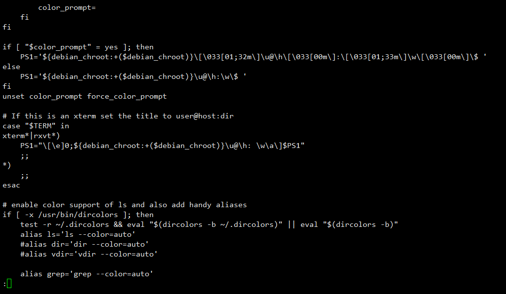 1 2 3 4 5 6 7 8 9 10 11 if [ -x /usr/bin/dircolors ]; then test -r ~/.dircolors && eval "$(dircolors -b ~/.dircolors) " || eval "$(dircolors -b) " alias ls ='ls --color=auto' alias grep='grep --color=auto' alias fgrep='fgrep --color=auto' alias egrep='egrep --color=auto' fi